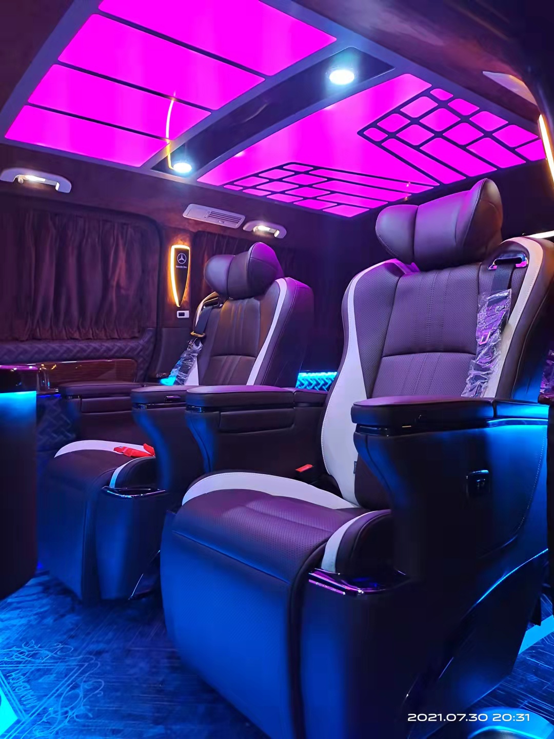 奔驰商务车国产唯雅诺轴距3200mm,车内高1338mm,宽1630mm,在这个长4993mm宽1905mm的空间里设计人员巧妙地安放进了五张座椅,在出厂状态下,乘员区的座椅是相对而坐的,这样的设计。